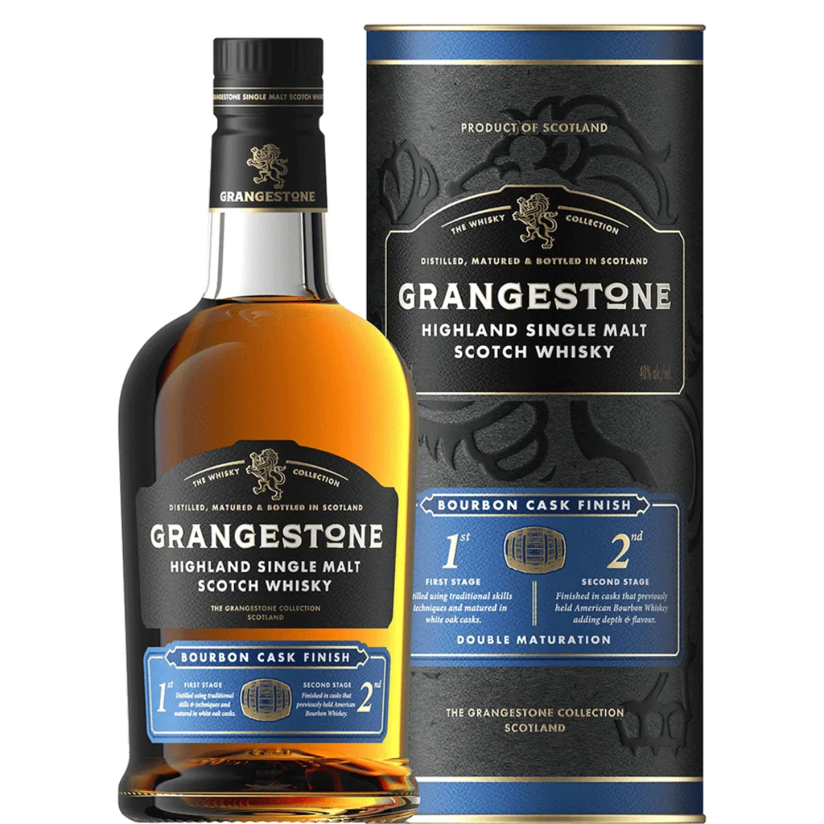 El Grangestone Bourbon Cask es un single malt escocés de las Highlands madurado inicialmente en barriles tradicionales de roble americano (ex-bourbon) y luego terminado en barricas de primer llenado de bourbon, con 40 % ABV, lo que le da un perfil limpio y accesible; combina notas verdes y frondosas como hierba fresca o flor de primavera con roble dulce, vainilla cremosa, fruta fresca y especias ligeras, logrando un sabor suave, equilibrado y dulce sin estridencias, ideal para quienes buscan un whisky amable pero con carácter. Un dato curioso: Grangestone es una marca “house brand” creada para tiendas minoristas, lo que significa que aunque no se sabe con certeza la destilería que lo produce, los maestros whiskies seleccionan cuidadosamente los barriles para lograr un perfil representativo del estilo de las Highlands.